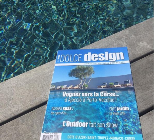 Le magazine Dolce Design nous a fait l'honneur d'un long article dans son numéro 5. Mais quelle ne fut pas notre surprise quand nous avons reçu l'exemplaire : la piscine des villas illustre la couverture du magazine ! Une belle reconnaissance de notre travail pendant plus d'un an pour rendre ce petit coin de maquis à Bonifacio aussi accueillant et calme que nous en avions envie pour partager...