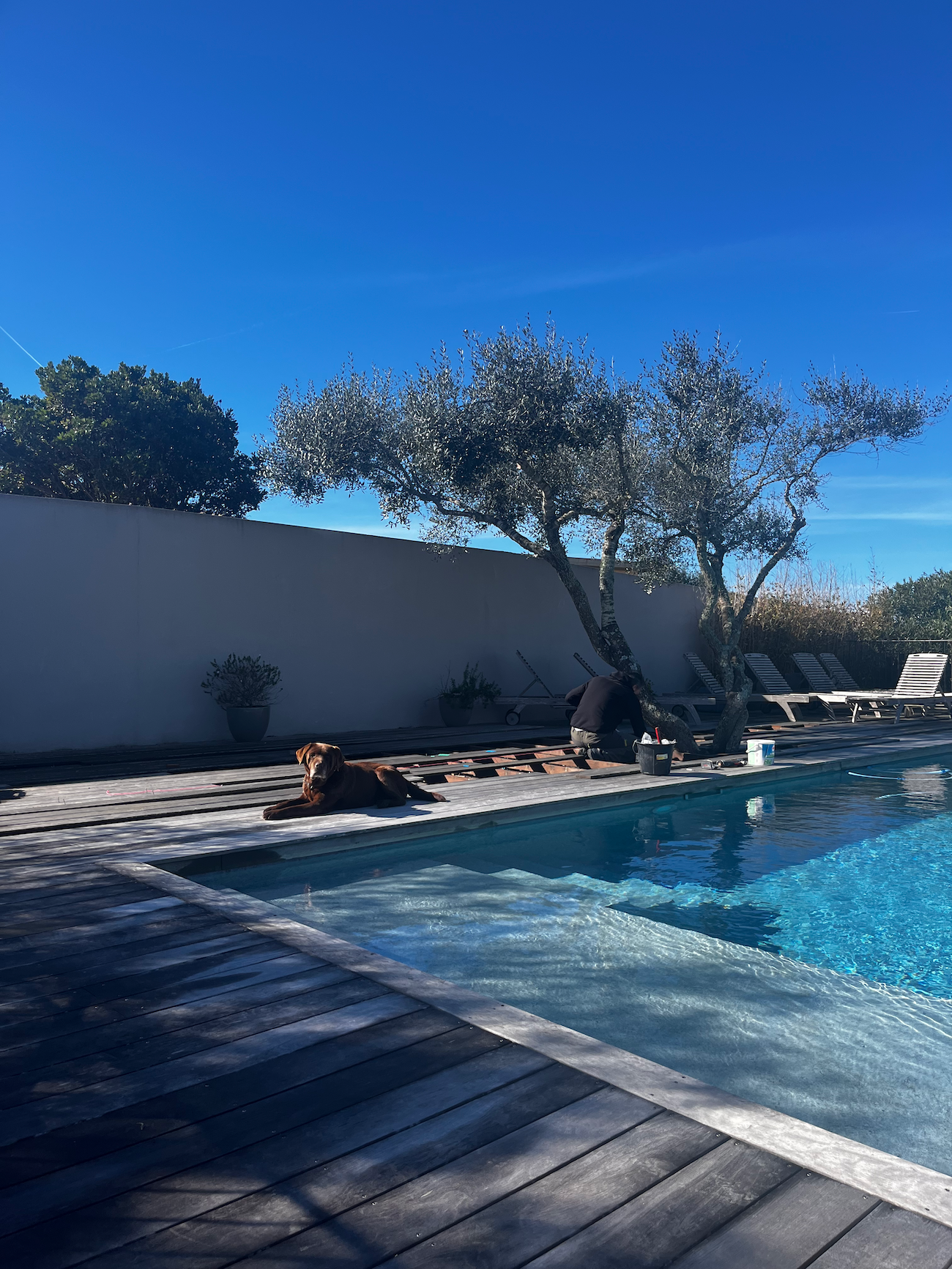 En ce moment nous consacrons notre temps à notre célèbre Olivier, celui qui vous protège du soleil lorsque vous vous prélassez à la piscine.Il était la bien avant nous et nous avons voulu qu’il garde sa place, les travaux terrassement ont été réalises en fonction de son emplacement et l’espace piscine à été pensée autour de cet olivier, au début par respect car il était inconcevable pour nous de ne pas garder cet arbre précieux …..